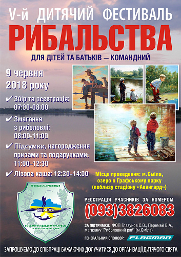 V-й Дитячий Фестиваль рибальства, який відбудеться з 07:00 9 червня 2018 року в м.Сміла на чарівному озері в Графському парку (координати гугл мапс - 49°13'26.5"N 31°51'55.2"E 49.224039, 31.865328).
